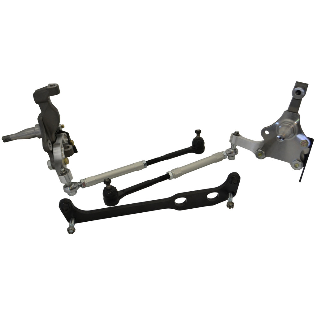 The TruTurnSystem includes tall spindles which induce more negative camber gain to maximize tire contact patch during cornering. It also include billet aluminum steering arms, center link adapter, tie rods and adjusters to virtually eliminate bumpsteer, correct Ackerman angle and allow for wider tires. This spindle is designed for use with 1967-1969 Camaro brake systems. Use Coversion kit part # 11529595 to utilize stock Corvette brakes.