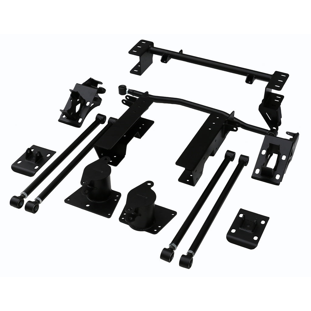 The Bolt-On Rear 4 Link System replaces the leaf springs to provide excellent ride quality, handling, traction and load capacity. It is completely bolt-on and provides mounting for the rear Shockwaves. The panhard is adjustable so you can optimize your tire clearance at the new lowered height and the mount has been located to optimize the bar length and angle for the lowered height. This helps keep the rearend centered in the truck and lowers the roll center to mimize body roll. The R-Joint rod ends combine the best qualities of low friction movement, lateral stability, full range articulation, and quiet operation into one special bearing that is as home on the street as it is on the racetrack! The C-notches are included with the kit and FIT the frame rail.